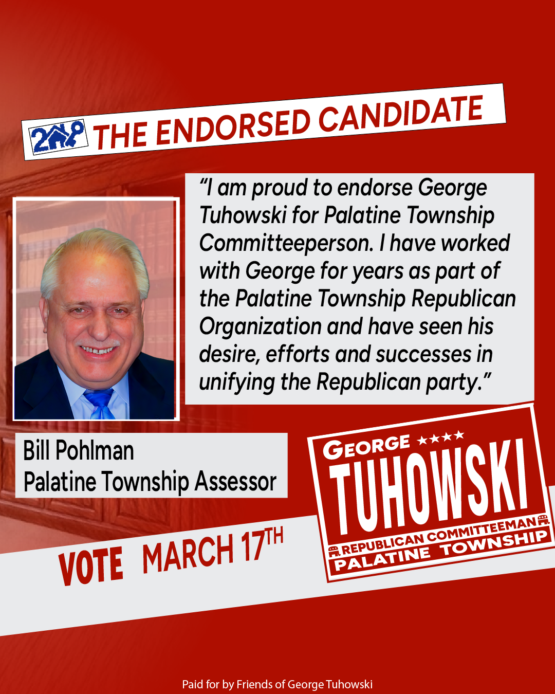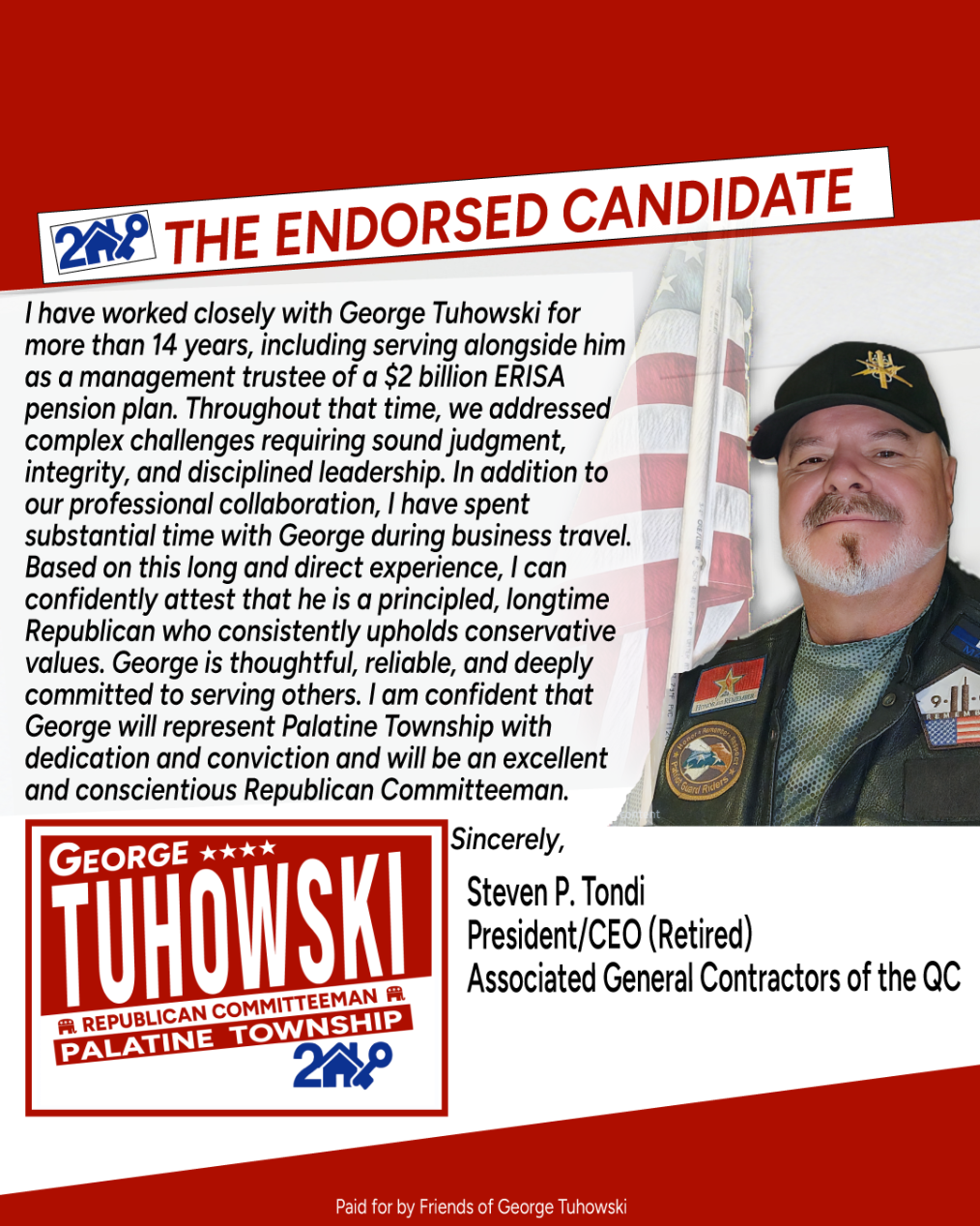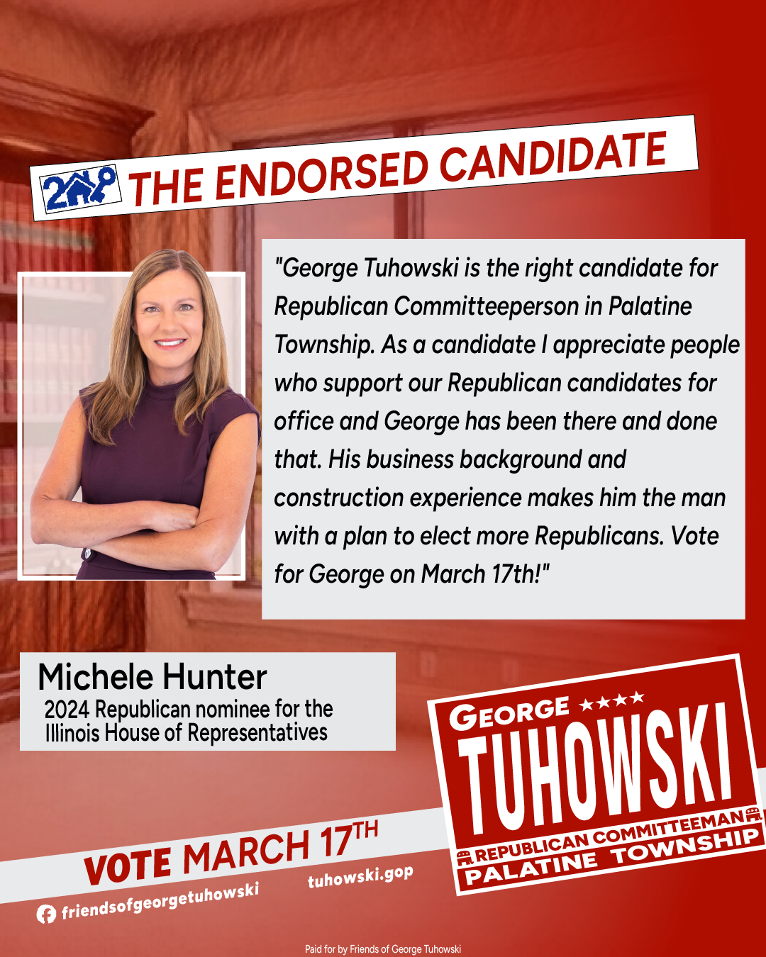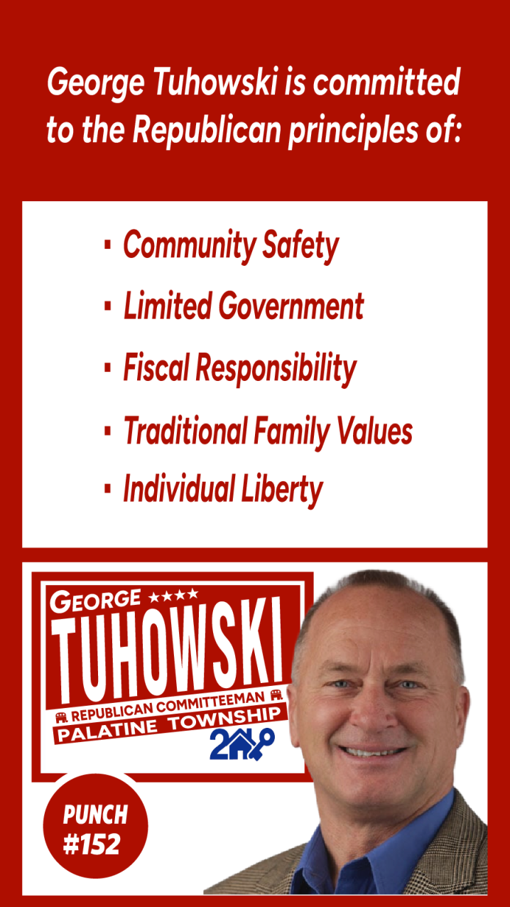 Paid for by Friends of George Tuhowski. A copy of our report filed with the State Board of Elections is (or will be) available on the Board’s official website (www.elections.il.gov) or for purchase from the State Board of Elections, Springfield, Illinois.